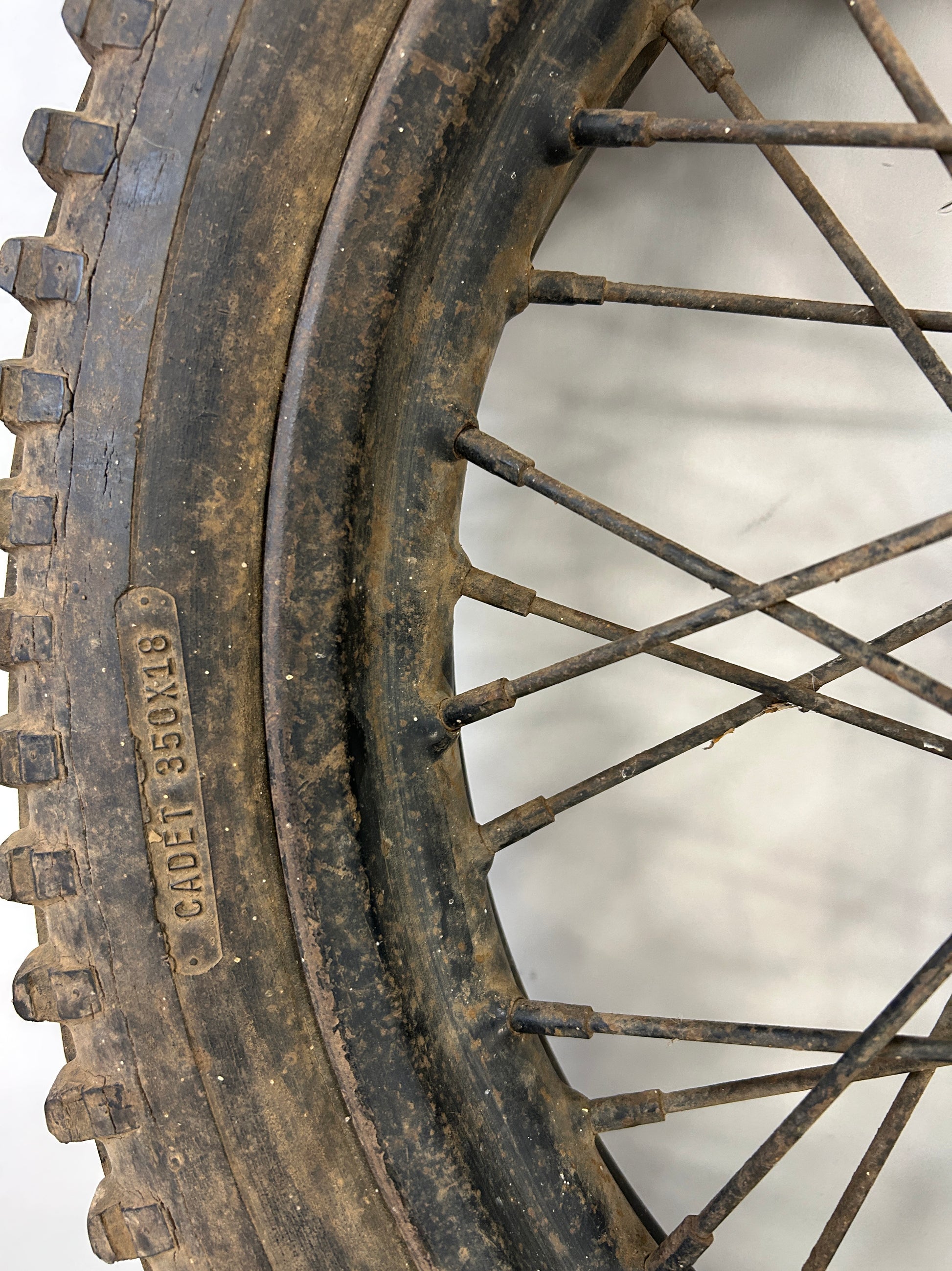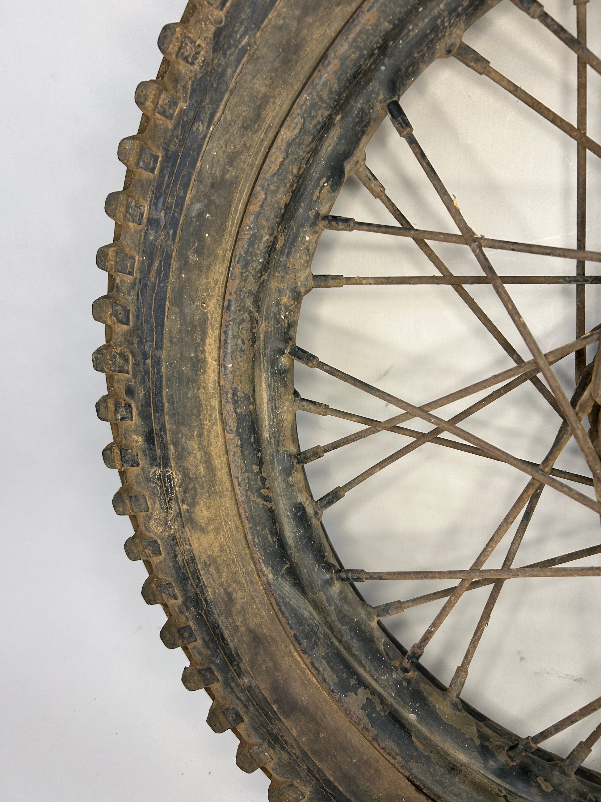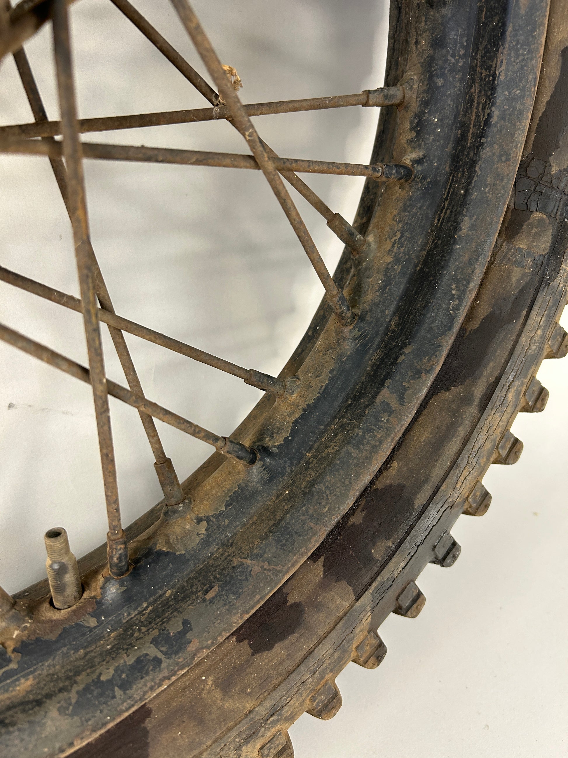 This crusty chopper wheel is perfect for your build. There are no major dents or broken spokes. The hub will need to be rebuilt.