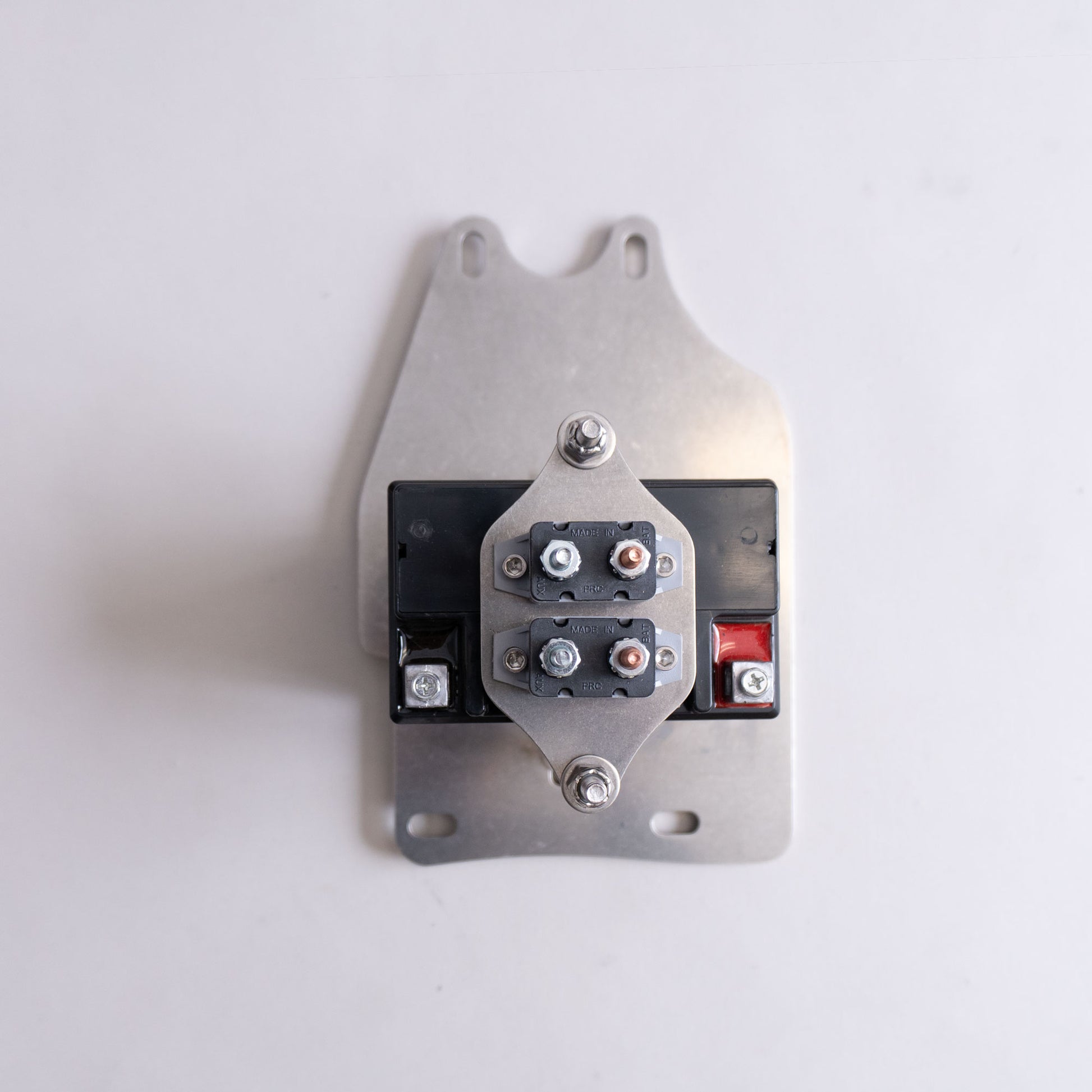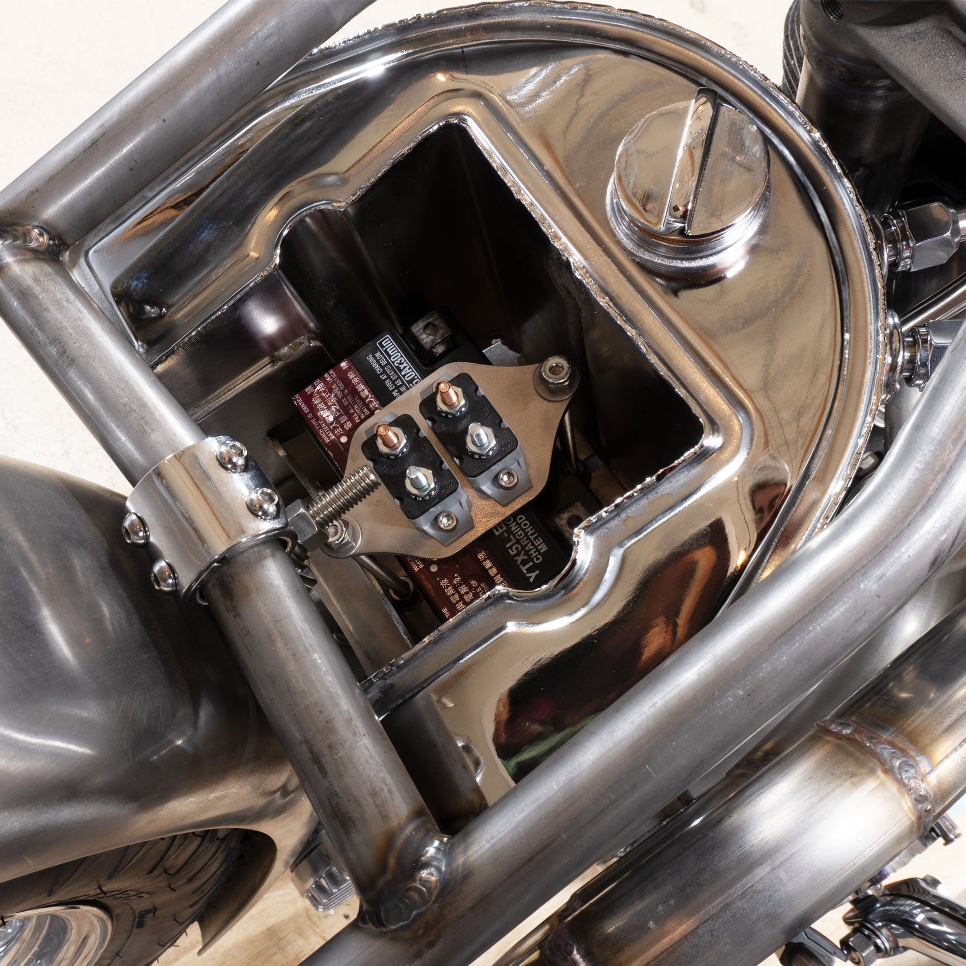 Our stainless plate has slotted holes for adjustability and includes a breaker plate with two 15-amp breakers—letting you separate your lights from your ignition right out of the box. Front tabs mount to your frame’s stock oil bag holes on the seat post tube, and our Dog Bone Support Bracket is the perfect way to lock down the rear.