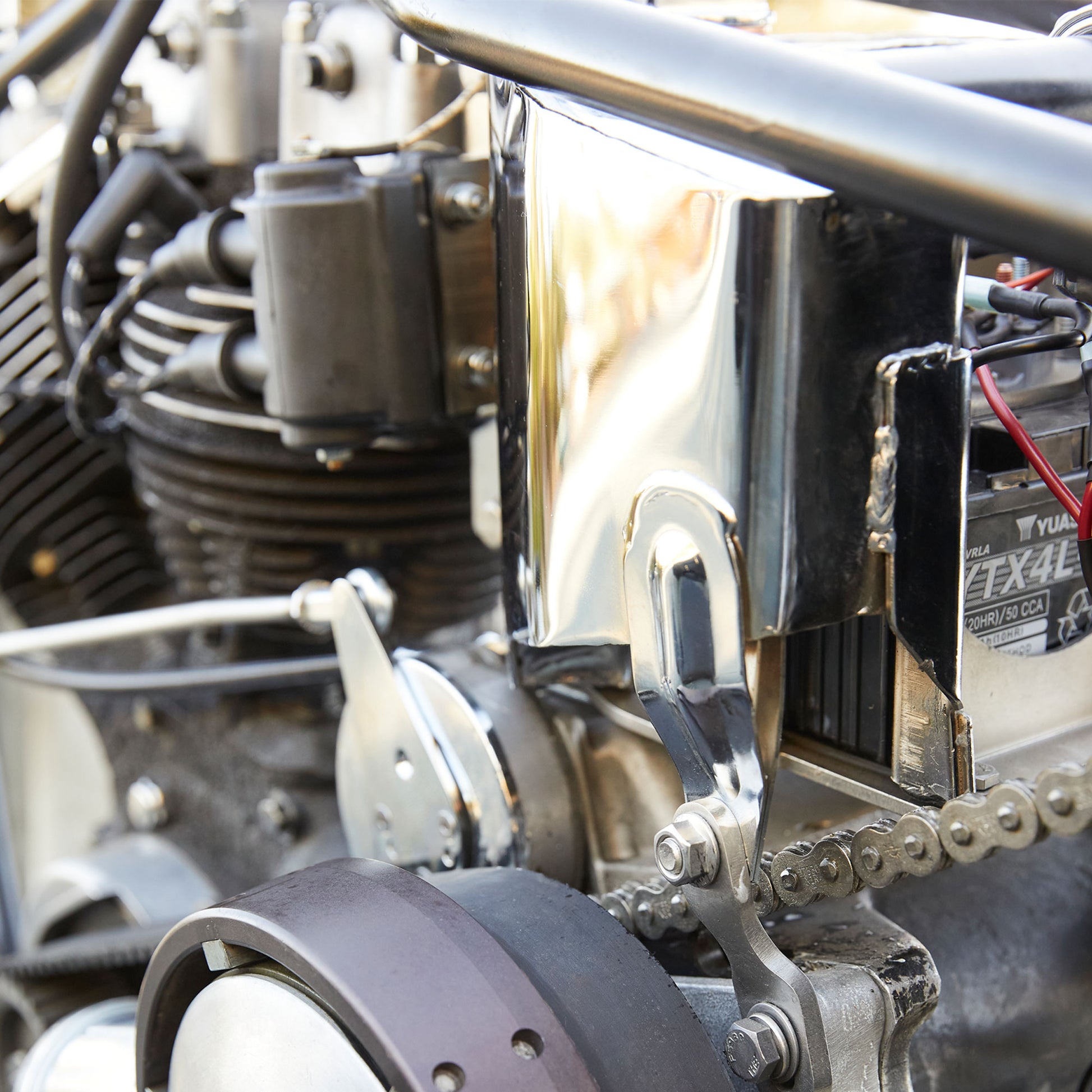 A clean solution for running a compact battery under your horseshoe oil tank—without hacking things together. Our stainless steel Horseshoe Battery Tray is designed to mount up below OEM, re-pop, and aftermarket horseshoe-style oil tanks on HD Big Twins from ’36–’84, and Evo Big Twins using our Weld-On Horseshoe Oil Tank Mount.