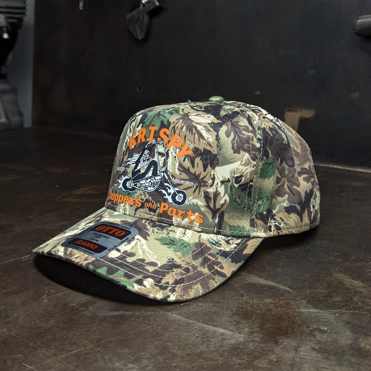 Classic mid-profile Otto structured snapback 5 panel hat, camo cotton/poly fabric with orange, black and white graphic.