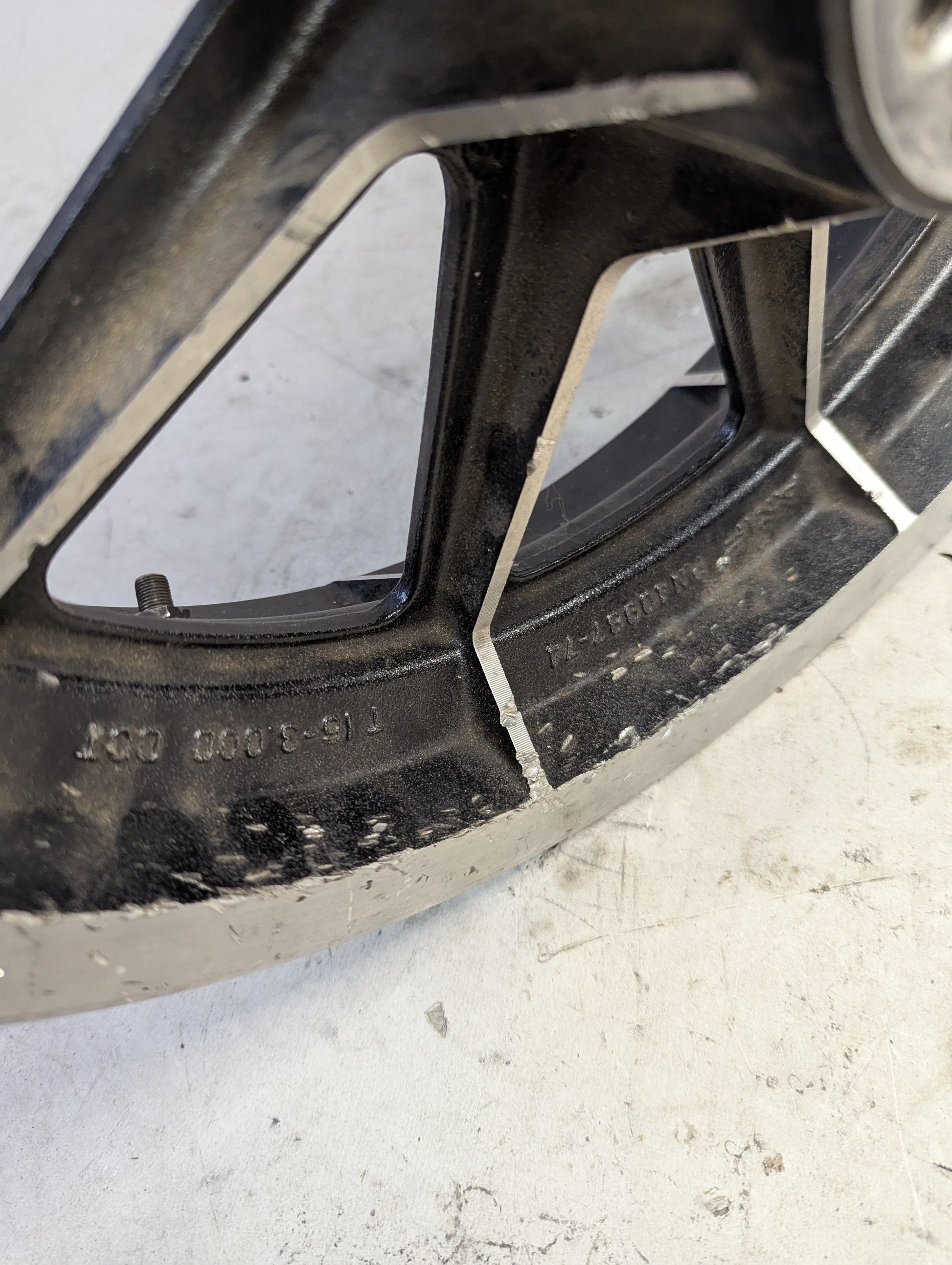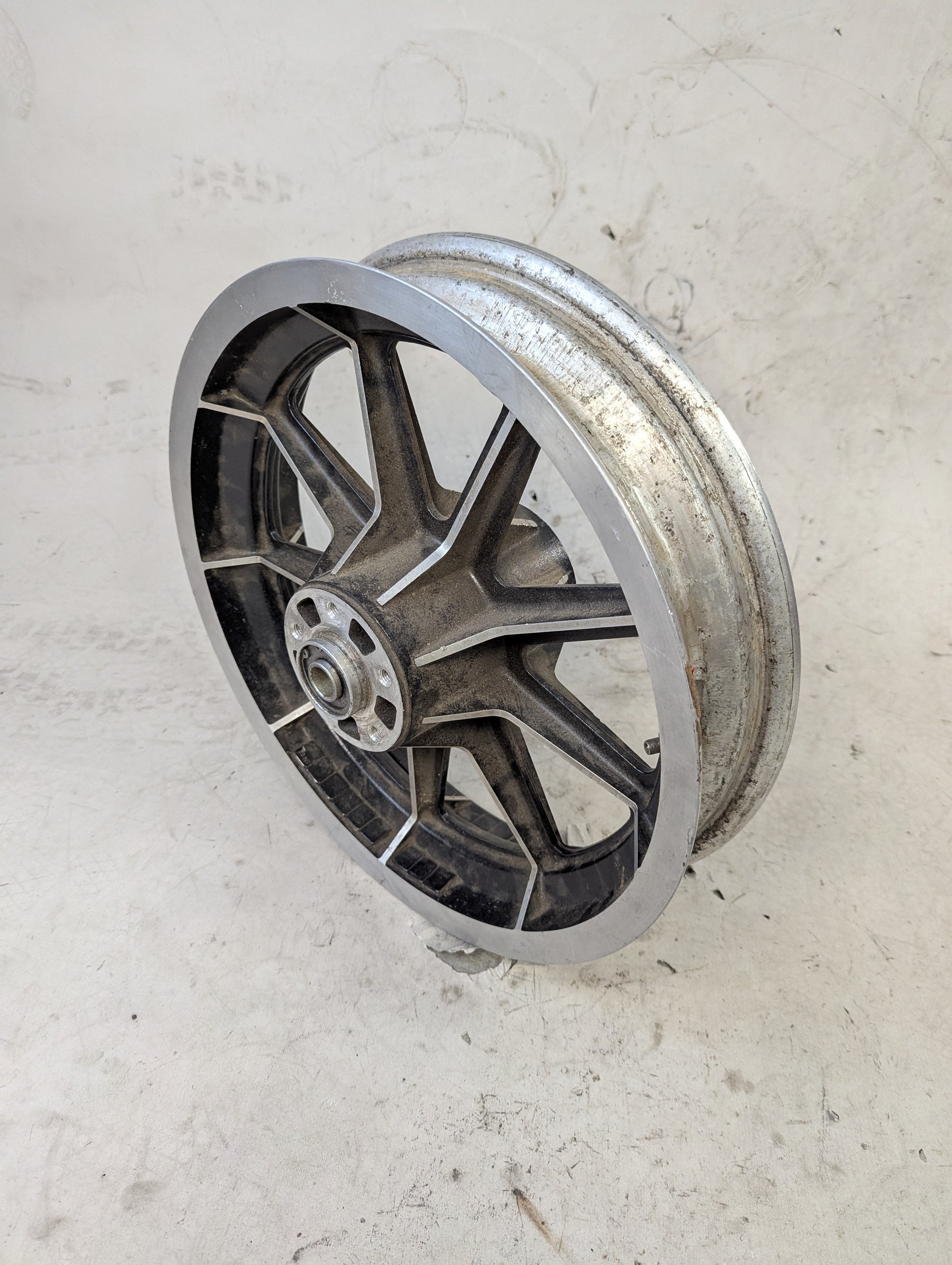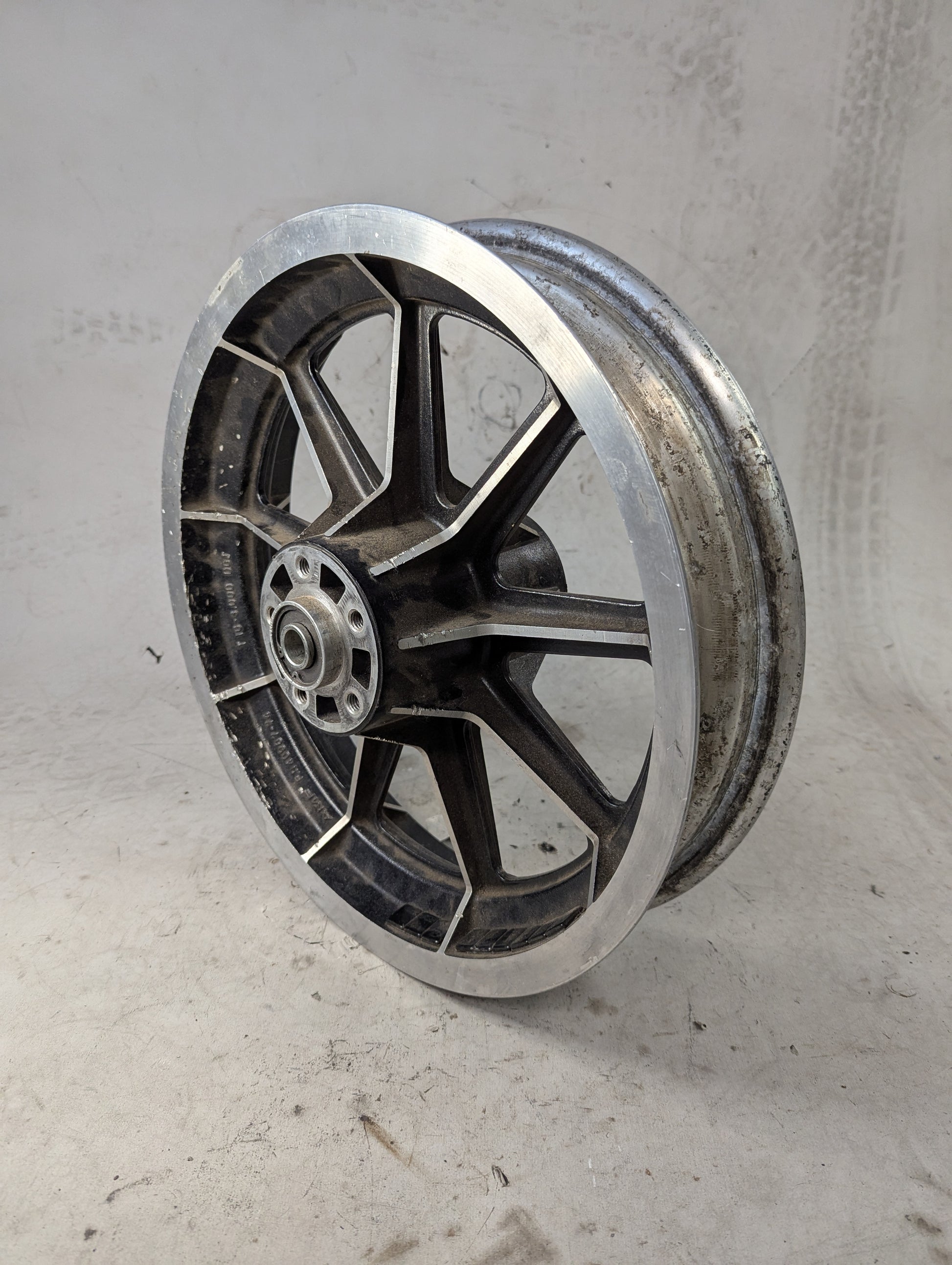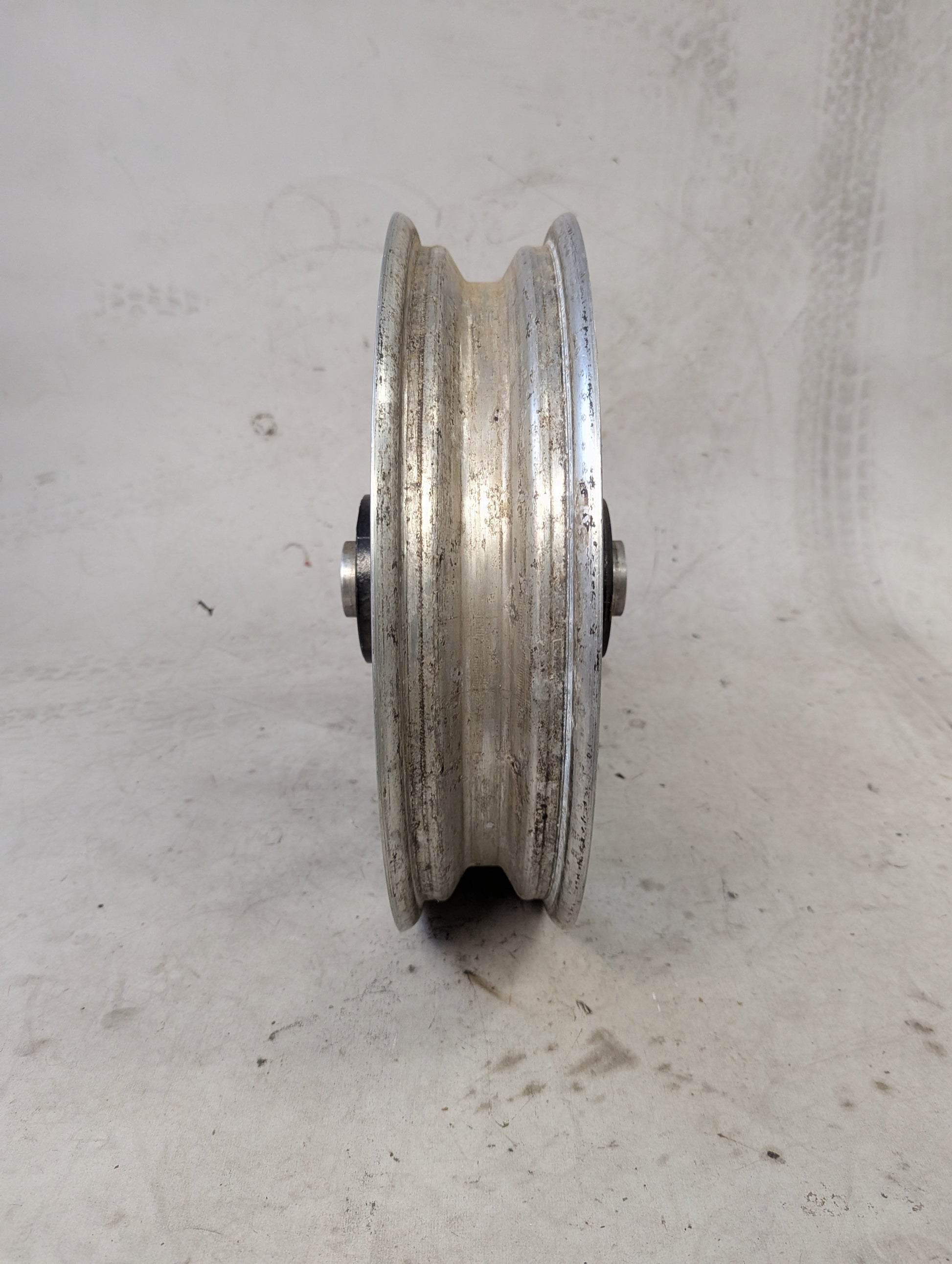 This wheel is a little chewed up on one side, as seen in the photos, but it has no major dents or cracks that affect performance. 3/4" timken bearings
