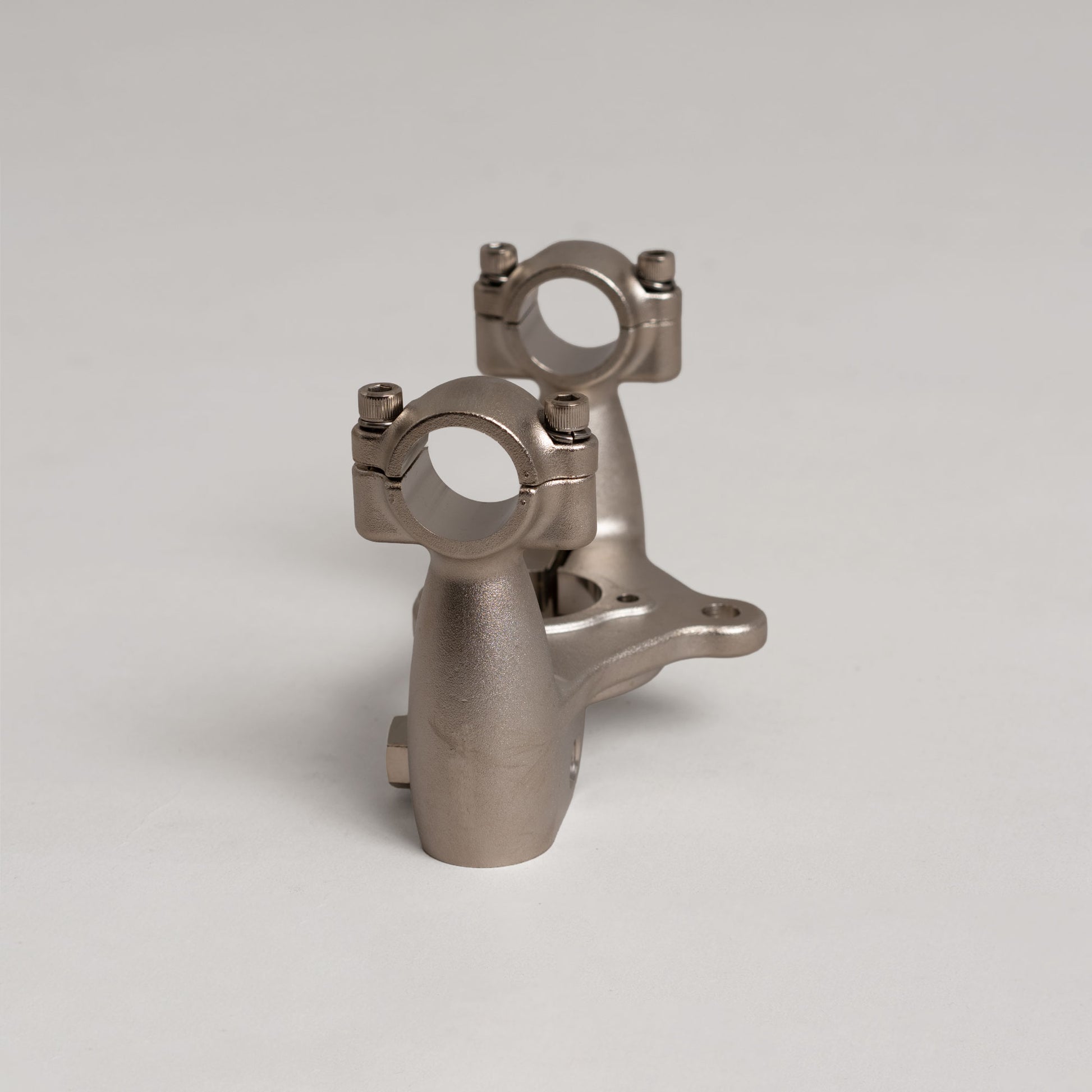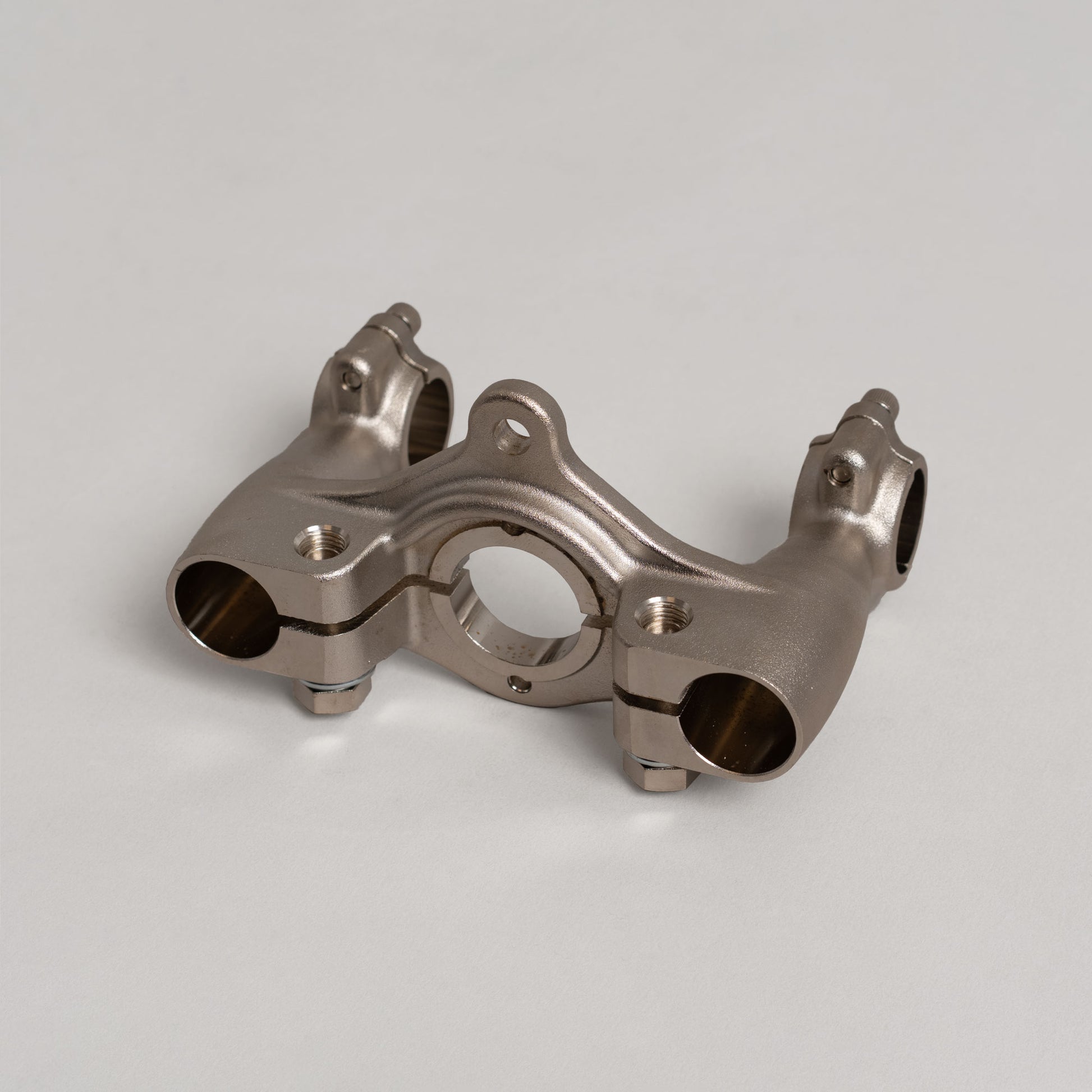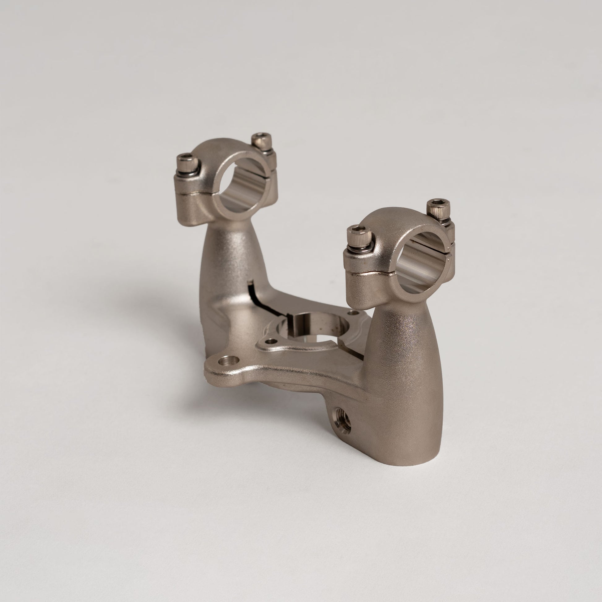 The riser is investment cast, finished with satin nickel plating and accepts standard 1” handlebars. Built tough, looks right, and ready to ride.